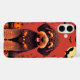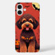 Une illustration de style cartoon d'un chien brun joyeux assis parmi des décorations sur le thème d'Halloween. Le fond est orange coucher de soleil avec une grande lune jaune et plusieurs chauves-souris volantes.