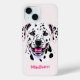 Cette image présente un chien dalmate joyeux avec des taches noires et blanches distinctives sur sa fourrure. Le chien porte un collier rose et a une expression joyeuse, avec sa langue pendante. L'arrière - plan est blanc cassé. Nom personnalisé