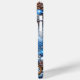 Chien joyeux, à la caricature. Le chien porte un chapeau de Père Noël rouge et une écharpe rouge assortie, ce qui lui donne un aspect festif. L'arrière - plan est ornée de flocons de neige bleus et de cônes de pins, contribuant à un thème hivernal ou de vacances. L'ambiance générale du design est ludique et joyeuse, ce qui le rend adapté à la saison des fêtes.