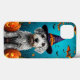 Chien adorable à la fourrure gris moelleuse, orné d'un casquette de sorcière violette fantaisiste qui a une boucle orange. L'arrière - plan est un turquoise vibrant, enrichi d'éléments éffrayants comme les chauves-souris volantes et les feuilles d'automne. À côté du chien se trouvent deux citrouilles sculptés, chacun présentant des visages expressifs et ludiques qui contribuent à une ambiance festive d'Halloween. L'association du charme du chien et des décorations d'Halloween crée une scène animée et enchanteresse.