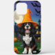 Chien joyeux portant un chapeau de sorcière orange vif, sur fond effrayant d'Halloween. Le chien, probablement une race de spaniel, a un pelage noir et blanc brillant et un grand sourire heureux. Derrière le chien, une pleine lune éclaire un ciel sombre rempli de chauves-souris en vol.