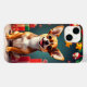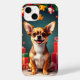 Un chien Chihuahua joyeux assis sur un fond festif de vacances comportant des ornements colorés, des rubans et des boîtes de cadeaux emballés. Cette image capture l'essence chaleureuse et joyeuse de la saison de Noël.