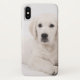 Photographie d'un jeune golden retriever se couchant sur un fond blanc.