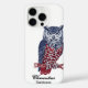 Une sculpture détaillée en bois d'un hibou, avec des motifs complexes dans les tons bleu et rouge. Le hibou est perché sur une branche, montrant ses talons aiguisés et son regard attentif.