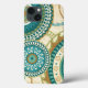 © Veronique Charron / Wild Apple. This image of circular patterns feature blue and gold colors. The image has a tan colored, floral patterned background.