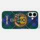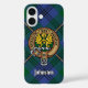 Clan Johnston crête badge entouré d'une sangle et boucle sur l'arrière - plan tartan. Texte personnalisé.