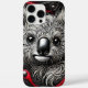 Un gros plan sur un koala, mettant en valeur des motifs et des textures complexes dans un style artistique unique. Le sujet a de grands yeux expressifs et un pelage duveteux, sur un fond audacieux qui met en valeur ses caractéristiques.
