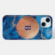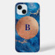 Élégant design abstrait ressemblant à une géode bleue avec des détails dynamiques de rose gold, présentant un espace vide circulaire central idéal pour la personnalisation. Parfait pour les fonds, les invitations ou les projets visuels créatifs.