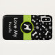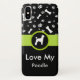 Montrez combien vous aimez votre animal familier de race de chien de caniche avec ce cas élégant et à la mode de smartphone conçu avec les os de chien et le motif et le texte mignons d'empreinte de patte que vous pouvez personnaliser avec votre propre message de l'amour pour votre animal familier de famille. Inclut une silhouette d'un caniche dans un emblème sur le cas.