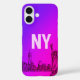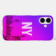 coque iphone avec un graphisme "NY" centré et réduit, un arrière - plan dynamique et une ligne d'horizon d'art noir avec Statue de la Liberté.