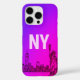 coque iphone avec un graphisme "NY" centré et réduit, un arrière - plan dynamique et une ligne d'horizon d'art noir avec Statue de la Liberté.