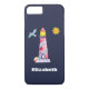 Un étui téléphonique personnalisé avec thème nautique. Arrière - plan bleu marine. Un phare rayé rouge et une boule de plage, avec un soleil souriant et une mouette volante au loin.