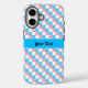 Boîtier de téléphone pour Apple iPhone 16 avec drapeau de la fierté transgenre rose, blanc et bleu ; design de la fierté trans motif de damier ; avec modèle de texte personnalisé pour votre nom ou message