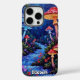 Ce tableau représente une scène forestière fantastique avec un flux bleu vif qui traverse un paysage parsemé de champignons lumineux. L'oeuvre présente une texture d'impasto lourde, avec des coups de pinceau épais et tourbillonnants qui donnent à la scène une sensation onirique et autre. Les champignons présentent une gamme de couleurs éclatantes, allant du bleu profond et du violet au rouge vif et aux oranges, et sont nichés au milieu d'un feuillage verdoyant et de fleurs colorées. De grands arbres encadrent la scène, ajoutant de la profondeur à cette vision magique de la forêt.