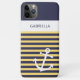 Belle ancre contemporaine de navire, sur un motif classique et chic bleu marine et couleur estivale claire rayures. Avec espace pour personnaliser ou customiser avec le nom, les initiales ou le monogramme de votre choix sur un arrière - plan de couleur blanche. Belle couverture moderne et cool pour le brancheur tendance et amateur d'art branché hip, amoureux de motifs artistiques qui veut protéger leur téléphone de la poussière et de la saleté, de l'usure et de la déchirure. Cette conception est disponible Apple iPhone 6, 7 et 8 Plus, 10 ou X, XR, XS, 11, 12, 13 Mini, 14 Plus et Pro Max coques de téléphone cellulaire. Montrez votre style personnel, regardez à la mode et se sentir élégant avec un design unique sur un appareil mobile accessoire de votre choix.
