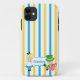 Cute Alice in Wonderland personnalisé iPhone 11 cadeau coque pour un amoureux du livre ou un bibliothécaire. La petite fille Alice dans sa robe bleue et le chapeau Mad s'assoient sur de jolies rayures bleues et jaunes sur cette étui téléphonique fantaisiste.