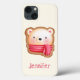 Un étui téléphonique avec un visage d'ours adorable et mignon sur une base de biscuits. Portant un foulard rayé rouge et blanc.