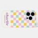 Boîtier de téléphone avec un motif de damier rose clair, jaune, violet et bleu aqua et votre nom dans un style rétro, police violet avec une ligne de texte personnalisé ci-dessous. Toutes les couleurs sont personnalisables.