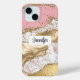 Un étui téléphonique avec un motif de style abstrait. Couches de marbre rose, d'or, d'or rose et de parties scintillant faux or.