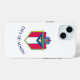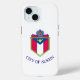 iPhone 15 Coque avec le drapeau d'Austin, Texas. Un drapeau blanc avec les armoiries de la ville au centre