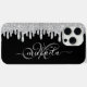 Éclairage brillant argent gris et noir Monogram iPhone 15 Coques. Personnalisez les accessoires girly avec votre nom et votre initiale. Le gris argenté clair dégoulinant fausse parties scintillant scintille sur le noir. Nous utilisons des photos d'étincelles. Veuillez noter que c'est une photo de parties scintillant !