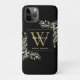 Elégante aquarelle verdure feuille monogramme de nom étui de téléphone avec un monogramme d'or initial sur un arrière - plan noir chic. Conçu par Thisisnotme©