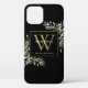 Elégante aquarelle verdure feuille monogramme de nom étui de téléphone avec un monogramme d'or initial sur un arrière - plan noir chic. Conçu par Thisisnotme©