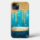 "Girly turquoise ombre à parties scintillant bleue gouttes d'or qui scintillent, mis en évidence par des étoiles glam et votre nom personnalisé iPhone 13 Coque." Sparkling bleu ombre parties scintillant avec gouttes d'or parties scintillant gouttes superposition et un trait de brosse en feuille d'or qui encadre votre nom personnalisé. Le design parfait pour une petite galerie contemporaine !