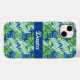 De belles feuilles tropicaux et des frondes de palmiers dans les tons verts, sur un arrière - plan bleu royal crée un étui téléphonique magnifique et luxueux. Un ruban bleu, à l'ombre de l'arrière - plan, porte votre nom en vert pâle.