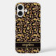 Personnalisez cette coque iPhone 16 avec impression léopard en feuille d'or sur fond métallisé marron brossé avec votre nom dans une police de caractères moderne tendance dans une feuille d'or sur noir coordonnée. C'est tellement chic !
