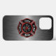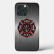 Badge du logo rouge du service d'incendie sur arrière - plan d'impression de texture en métal brossé. Idéal pour les pompiers et les premiers répondants.