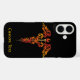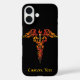 Double caducée de serpent. Icône créée avec des éléments de flamme. Couleur arrière - plan personnalisée. Texte personnalisé.