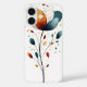 Une tige florale abstraite aux teintes orange, marine et rouge danse vers le haut avec des points épars, élégant et animé avec une touche de fantaisie.