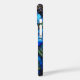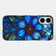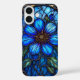 Vitraux vitrés vitrés vitrés qui représentent une grande fleur bleue aux détails complexes, entourés de feuilles et de bourgeons verts. L'arrière - plan est décoré dans les tons bleus et les motifs géométriques, ce qui renforce l'élégance générale de l'oeuvre.