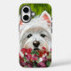 West Highland White Terrier et fleurs roses. Westie chien regardant au-dessus d'un buisson fleuri. Sophie. Copyright © 2025 Angi Laframboise. Le chien d'art brasse des cadeaux pour les amoureux de les chiens.