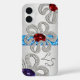 Ce magnifique coque en coque rigide pour votre iPhone 16 présente une peinture numérique originale de broches à la mode en forme de fleur incrustées de diamants, de rubis et de tanzanite, posée sur un arrière - plan en aluminium brossé bagué de topaz bleu. Les champs de texte personnalisables pour vos initiales complètent le look.