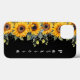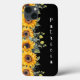 Prénom personnalisé élégant tournesol jaune sur noir arrière - plan nom personnalisé coque iphone, est un mélange de charme rustique et de style moderne, féminin et chic. Ce boîtier téléphonique est doté de tournesols audacieux et dynamiques.