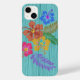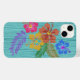 Fleurs hawaïennes rustiques et coque iPhone 6 feuille. Des fleurs colorées d'hibiscus, roses, bleues et jaunes sont imprimées sur un arrière - plan en bois bleu aqua.