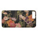 Motif floral oriental traditionnel en rose, orange et violet contre un arrière - plan noir.