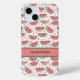 Ce boîtier de téléphone cellulaire fraîchement cueilli présente un joyeux motif de tranches de pastèque rose et verte sur une couleur crème blanche, parsemé de graines brunes dans la pastèque et arrière - plan. Votre nom de monogramme apparaît en gras, typographie moderne en vert foncé au milieu sur un bloc de couleur rose pastèque. Cette conception amusante de téléphone mobile ajoutera la saveur de l'été et une touche de fruit à votre routine quotidienne avec votre téléphone. C'est une conception moderne de style vintage et rétro.