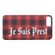 Moto écossaise Fraser Tartan Je Suis Prest coque électronique. L'arrière - plan est le tartan du clan Fraser en rouge noir et blanc.