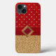 Coque iphone glamour réalisé en graphisme de parties scintillant or, sur la moitié inférieure et un rouge avec des points de parties scintillant or, sur la moitié supérieure. Un ruban rouge traverse le milieu avec des graphiques chics d'un rubis sertis dans un décor en diamant doré. Magnifique étui téléphonique.