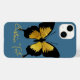 Papillon accrocheur dans la conception de vol avec un texte personnalisé couleur or pour un nom ou un message. Le design présente une illustration d'un papillon avec des rayures de couleur noire et d'or jaune brillant contrastant. Les ailes sont prolongées, toujours dans les mêmes couleurs noir et or. Le texte personnalisé est de style calligraphie, tournant autour du papillon dans un or jaune clair. Ce simple design papillon est placé contre une couleur arrière - plan bleu denim.