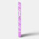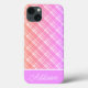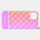 Ce coque iphone dispose d'un motif plaid à dégradé orange et violet avec une bande violet épaisse et une bande blanche mince avec un nom personnalisable.