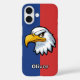 Ce boîtier téléphonique personnalisé présente une conception de tête d'aigle de dessin animé déterminée contre un arrière - plan bleu et rouge éclatant.
