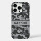 Customize this gray camouflage iPhone 16 pro case with your name in a trendy modern CAP font in dark gray on light gray. It's masculine and perfect for your favorite military, hunting, country or outdoorsman!