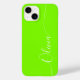 Green White Elegant Calligraphy Script personnalisé Nom personnalisé iPhone 14 Smart Phone Boîtes dispose d'un design moderne et tendance simple et élégant avec votre nom personnalisé dans élégante calligraphie manuscrite typographie de script sur un arrière - plan vert. Conçu par ©Evco Studio www.zazzle.com/store/evcostudio