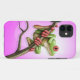 Une grenouille d'arbre verte est étée perché sur une branche devant un arrière - plan rose-clair. La grenouille regarde vers la droite avec une de elle est les yeux rouges lumineux évidents. Du petit les mains rouges et les pieds type sont enroulés autour d'une branche brune mince qui commence au fond de la conception et se relève et vers la gauche. Cette conception lumineuse et colorée fait un cas iphone4 mignon et espiègle.