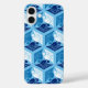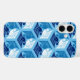 Coque dans un kimono japonais classique motif de grues stylisées, arrangé dans un motif d'hexagones, en bleu marine / indigo, bleu moyen et blanc, sur un arrière - plan bleu ciel clair