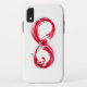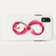 Infinity symbole of continuous stream of red pouring into glass glass glass on white background.
